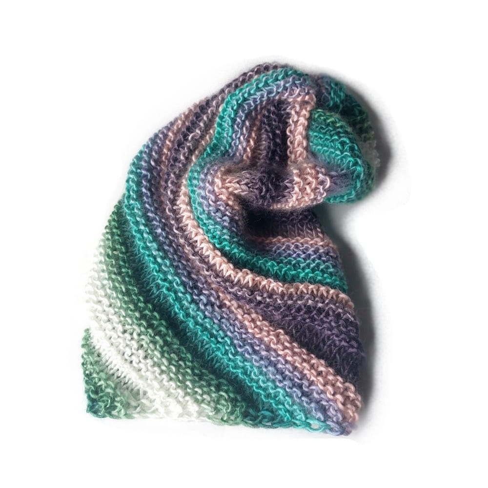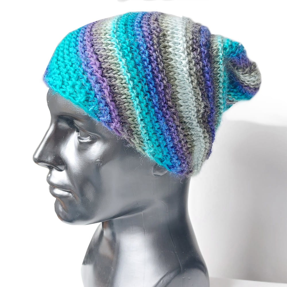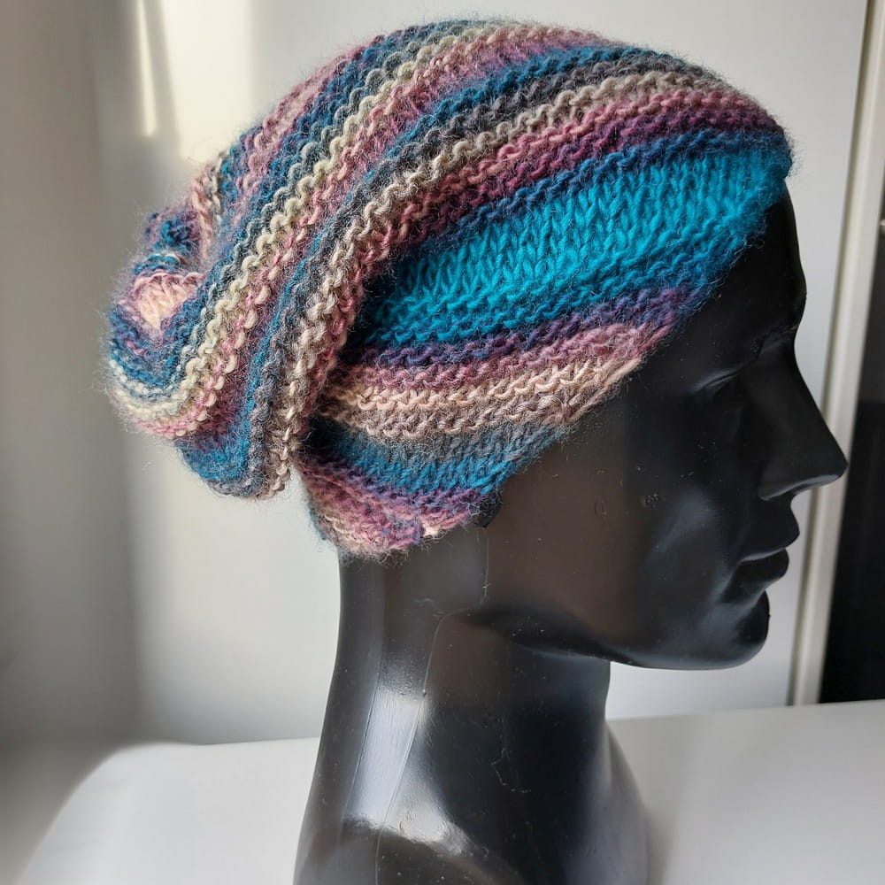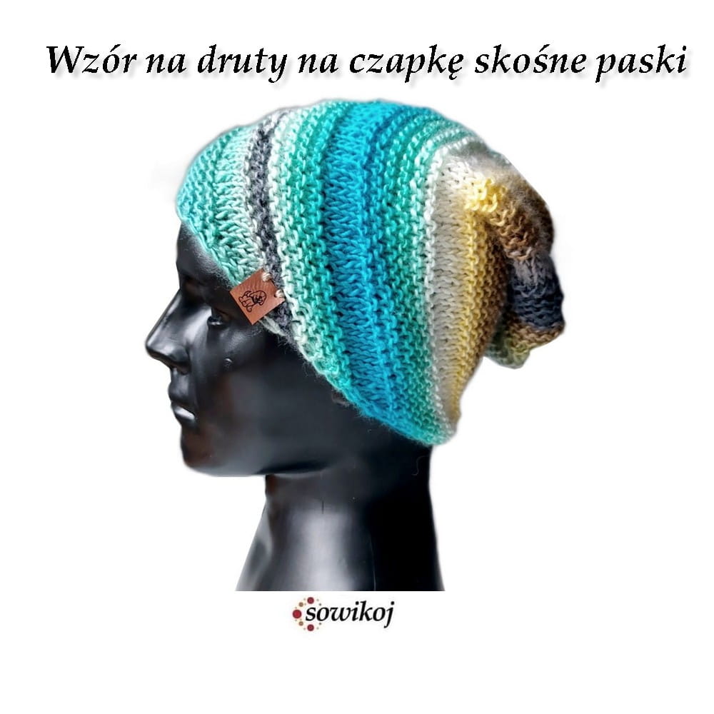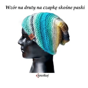 Wzór na czapkę w skośne paski wykonaną na drutach.