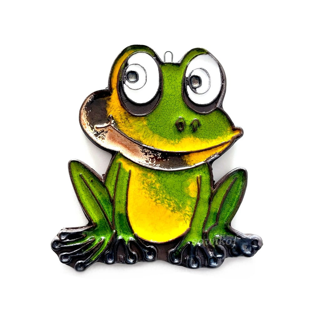 Wesoła żabka dostępna w róznych wariantach kolorystycznych. W całości autorska i ręcznie wykonana praca. Ceramika. Ciekawa, zabawna zawieszka ścienna.